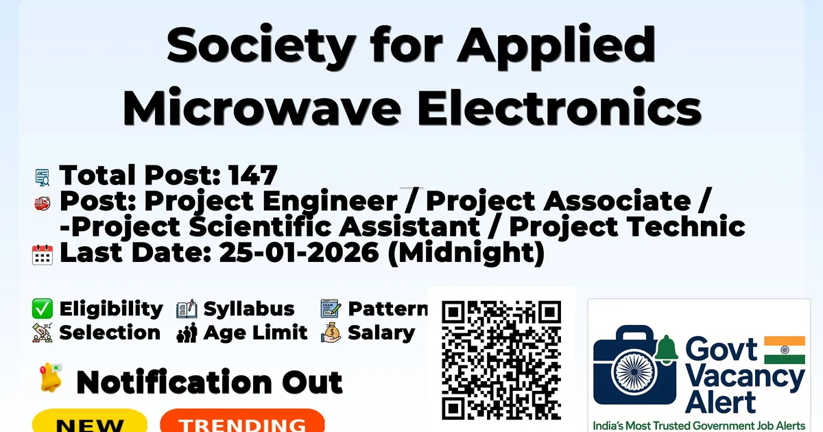 Society for Applied Microwave Electronics Engineering and Research (SAMEER) has released an official notification for the recruitment of 147 Project Engineer, Project Associate and Other Posts. Interested and eligible candidates can apply Online through the official SAMEER website. The last date to submit the application form is 25-01-2026. In this article, you’ll find the SAMEER Project Engineer, Project Associate and Other Posts recruitment details, including eligibility criteria, age limit, salary structure, selection process, application steps, and direct links to the official notification and Online application form.