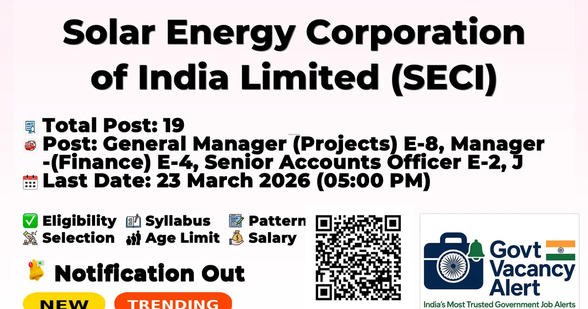 Company Name Solar Energy Corporation of India Limited (SECI) Post Name General Manager (Projects) E-8, Manager (Finance) E-4, Senior Accounts Officer E-2, Junior Accountant S-1, Senior Engineer (O&M) FTE E-2, Sr. Consultant (Business Development) No of Posts 19 Advt No 02/2026 Salary Regular: ₹22,000 – ₹2,80,000 (IDA) + perks Fixed Term: ₹50,000 consolidated Consultant: ₹1,25,000 per month Qualification BE/B.Tech (Electrical/Civil/Mech/EEE), CA/CMA, MBA-Finance, M.Com/B.Com (as per post) Start Date for Apply 23 February 2026 (11:00 AM) Last Date for Apply 23 March 2026 (05:00 PM) Official Website www.seci.co.in