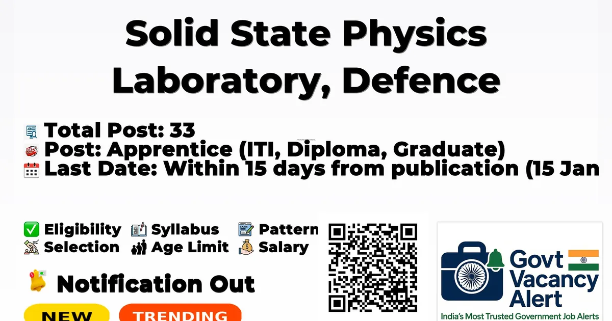 Company Name Solid State Physics Laboratory, Defence Research & Development Organisation (SSPL) Post Name Apprentice (ITI, Diploma, Graduate) No of Posts 33 Salary Stipend as per rules Qualification ITI/Diploma/Graduate/B.E./B.Tech (First Division) Start Date for Apply 01 Jan 2026 Last Date for Apply Within 15 days from publication (15 Jan 2026) Official Website drdo.gov.in