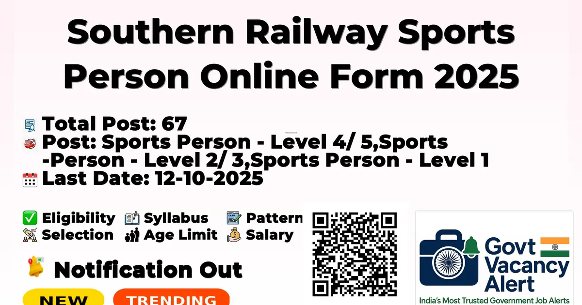 The Southern Railway Recruitment 2025 for 67 posts of Sports Person. Candidates with Any Graduate, ITI, 12TH, 10TH Can Apply Online. The online application opens on 13-09-2025, and closes on 12-10-2025. The candidate shall apply online through Southern Railway website, rrcmas.in.
