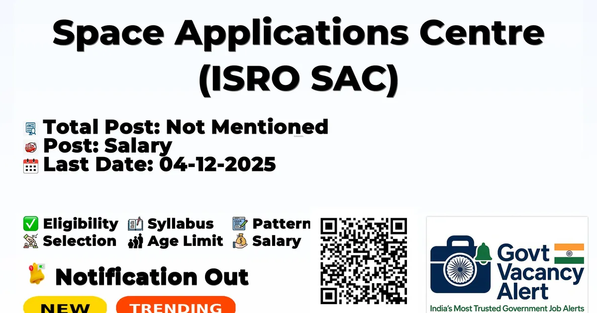 Company Name Space Applications Centre (ISRO SAC) Post Name Apprentices No of Posts Not Mentioned Salary Rs 11,040 to 12,300 Qualification Graduate, B.Arch, B.Tech/B.E, Diploma, ITI, 10TH Age Limit 18 to 35 years Start Date for Apply Online 14-11-2025 Last Date for Apply Online 04-12-2025 Official Website sac.gov.in