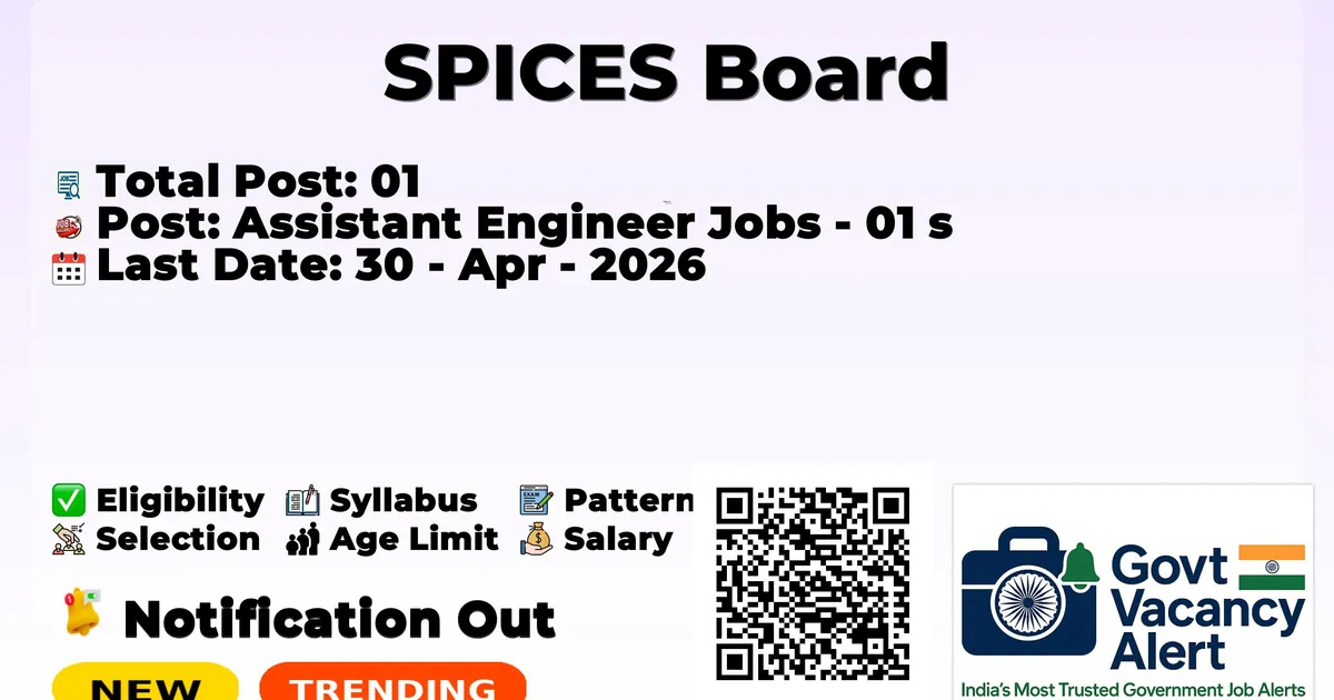 The Spices Board of India (Spices Board) has officially released the notification to fill the vacancies of 01 Assistant Engineer Posts. Interested and eligibile candidates can use this opportunity to apply for these posts before the last date of application. Candidates who have completed their Diploma in Electrical, Mechanical, and Civil Engineering can apply for the Spices Board Jobs 2026. The interested applicants can apply in online mode. Here we have mentioned the education details, age limit, selection process, application fee, salary, and how to apply for these posts before the deadline. The application dates have already begun.