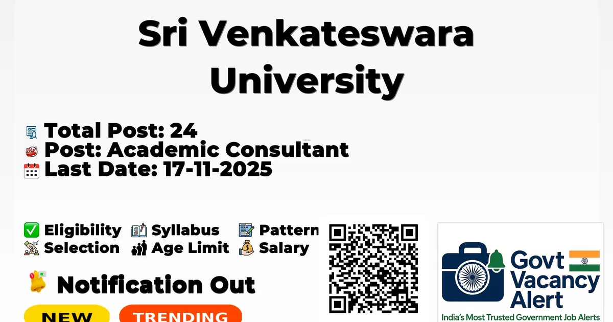 Sri Venkateswara University has released an official notification for the recruitment of 24 Academic Consultant Posts. Interested and eligible candidates can apply Online through the official Sri Venkateswara University website. The last date to submit the application form is 17-11-2025. In this article, you’ll find the Sri Venkateswara University Academic Consultant Posts recruitment details, including eligibility criteria, age limit, salary structure, selection process, application steps, and direct links to the official notification and Online application form.