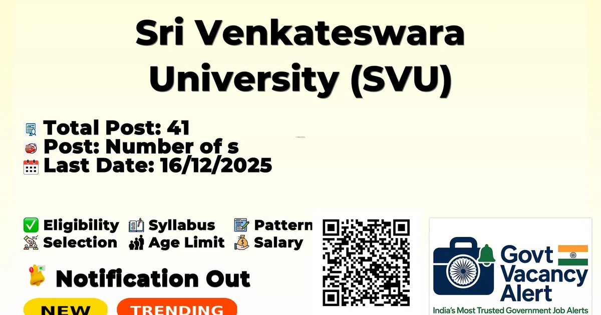Company Name Sri Venkateswara University (SVU) Post Name Research Associate, Project Associate, Project Fellow, Laboratory Assistant, Technical Assistant, Lab Assistant No of Posts 41 Salary Rs. 15,000 to Rs. 58,000 + HRA per month Qualification Graduate, M.A, M.Sc., M.Tech, Ph.D. (as per post requirement) Age Limit As per university norms Start Date for Apply 01/12/2025 Last Date for Apply 16/12/2025 Official Website www.svuniversity.edu.in