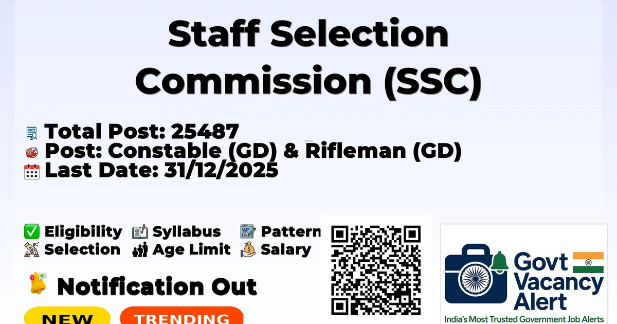 Staff Selection Commission (SSC) has released an official notification for the recruitment of 25487 Constable, Rifleman Posts. Interested and eligible candidates can apply Online through the official SSC website. The last date to submit the application form is 31-12-2025. In this article, you’ll find the SSC Constable, Rifleman Posts recruitment details, including eligibility criteria, age limit, salary structure, selection process, application steps, and direct links to the official notification and Online application form. Join Arattai Channel Trending Govt Jobs SSC 25487 GD Constable Online Form 2025 OICL 300 AO Online Form 2025 RRB NTPC 12TH Level Online Form 2025 3058 Post Intelligence Bureau (IB) 362 MTS Online Form 2025 RRB 2569 JE (Junior Engineer) Online Form 2025 Advertisement Company Name Staff Selection Commission (SSC) Post Name Constable (GD) & Rifleman (GD) No of Posts 25487 Salary ₹21,700 - ₹69,100 Per Month (Pay Level-3) Qualification Matriculation or 10th Class Pass from a recognized Board Age Limit 18 to 23 years (as on 01-01-2026) Start Date for Apply 01/12/2025 Last Date for Apply 31/12/2025 Official Website https://ssc.gov.in Force Male Female Total BSF 524 92 616 CISF 13135 1460 14595 CRPF 5366 124 5490 SSB 1764 0 1764 ITBP 1099 194 1293 AR (Rifleman GD) 1556 150 1706 SSF 23 0 23 Grand Total 23467 2020 25487 Citizen of India Must possess Domicile/PRC of the State/UT indicated in the application (except Assam & specified categories) Matriculation or 10th Class pass from a recognized Board/University as on 01-01-2026 NCC Certificate holders eligible for bonus marks (optional) Minimum Age: 18 Years Maximum Age: 23 Years (Born not earlier than 02-01-2003 and not later than 01-01-2008) Age Relaxation: SC/ST: 5 years OBC: 3 years Ex-Servicemen: 3 years after deduction of military service Children/dependents of 1984 riot victims (UR/EWS): 5 years Children/dependents of 1984 riot victims (OBC): 8 years Children/dependents of 1984 riot victims (SC/ST): 10 years General/OBC/EWS (Male): ₹100/- SC/ST/Ex-Servicemen/Female Candidates: No Fee Payment Mode: Online (BHIM UPI, Net Banking, Visa, Mastercard, Maestro, RuPay) Pay Scale: Pay Level-3 Salary Range: ₹21,700 – ₹69,100 Per Month All posts carry Dearness Allowance, House Rent Allowance, and other allowances as admissible Notification Date 01/12/2025 Starting Date to Apply Online 01/12/2025 Last Date to Apply Online 31/12/2025 (23:00) Last Date for Online Fee Payment 01/01/2026 (23:00) Application Form Correction Window 08/01/2026 to 10/01/2026 (23:00) Tentative CBE Exam Date February - April 2026 Computer Based Examination (CBE) Physical Standard Test (PST) Physical Efficiency Test (PET) Detailed Medical Examination (DME)/Review Medical Examination (RME) Document Verification