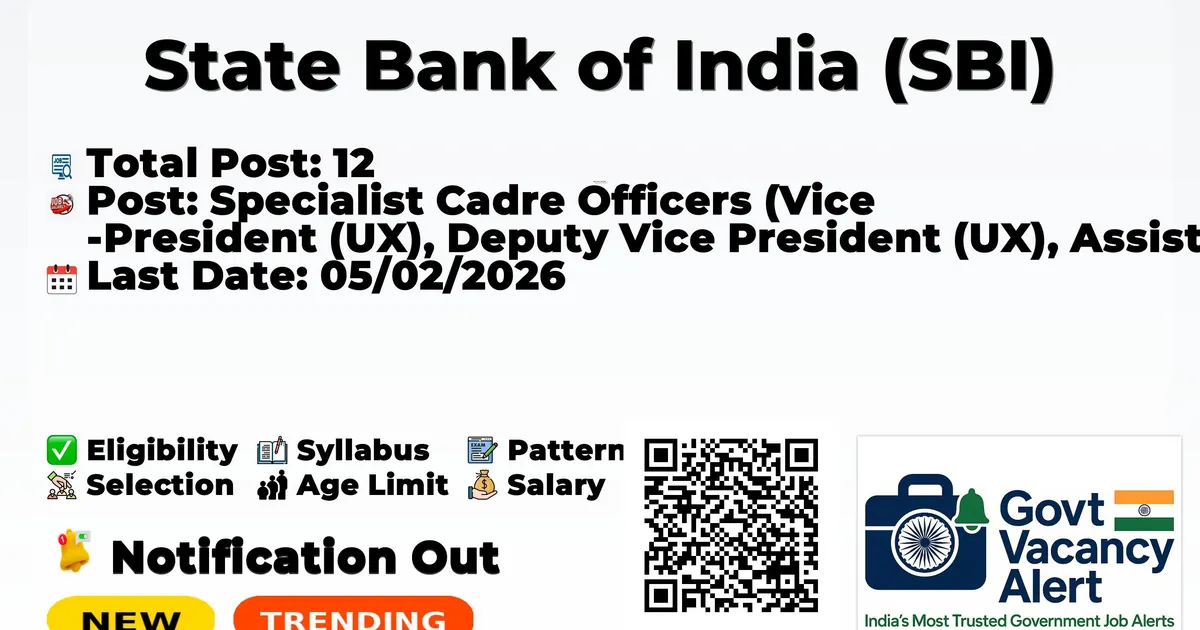 Company Name State Bank of India (SBI) Post Name Specialist Cadre Officers (Vice President (UX), Deputy Vice President (UX), Assistant Vice President (UX), Senior Special Executive (UI & UX), Deputy Manager (UI & UX)) No of Posts 12 Qualification B.Tech/B.E, M.Sc, M.E/M.Tech, MCA Age Limit 25 to 50 years (varies by post) Start Date for Apply 16/01/2026 Last Date for Apply 05/02/2026 Official Website https://sbi.co.in/web/careers/current-openings