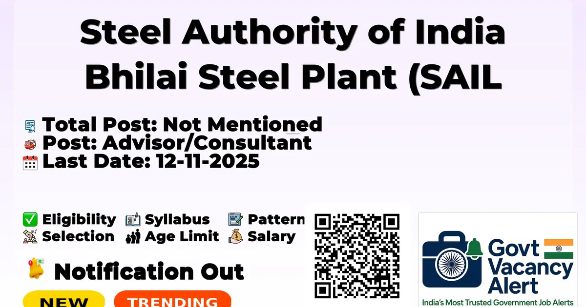 Company Name Steel Authority of India Bhilai Steel Plant (SAIL BSP) Post Name Advisor/Consultant No of Posts Not Mentioned Salary Rs 50,000 to 70,000 Age Limit 65 years Last Date for Apply 12-11-2025 Official Website sail.co.in