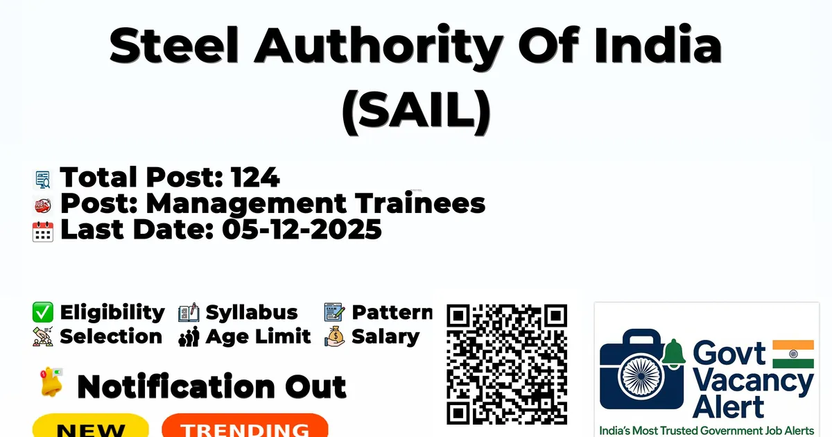 Steel Authority Of India (SAIL) has released an official notification for the recruitment of 124 Management Trainees Posts. Interested and eligible candidates can apply Online through the official SAIL website. The last date to submit the application form is 05-12-2025. In this article, you’ll find the SAIL Management Trainees Posts recruitment details, including eligibility criteria, age limit, salary structure, selection process, application steps, and direct links to the official notification and Online application form.