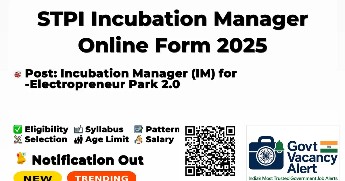 Details Information Organization Name Software Technology Parks of India (STPI) Post Name Incubation Manager (IM) for Electropreneur Park 2.0 Total Vacancies 01 Posts Salary/Pay Scale Rs.50,000 - 70,000/- Educational Qualification Any Graduate Age Limit 35 years (Age relaxation as per rules) Application Start Date 10-12-2025 Application End Date 30-12-2025 Application Mode Online Official Website stpi.in