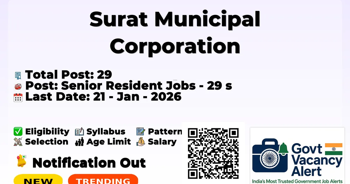 The Surat Municipal Corporation (SMC) has declared the official notification for 2026. To fill up the vacancies for 29 Senior Resident Jobs. Those candidates who have qualified in the MBBS, MD/ MS, and DNB can grab this chance and apply for the SMC Recruitment 2026. Here, we included the age limit, selection process, salary structure, education details, application fee, and how to apply for these posts. Interested candidates can attend the walk-in at the address given below.