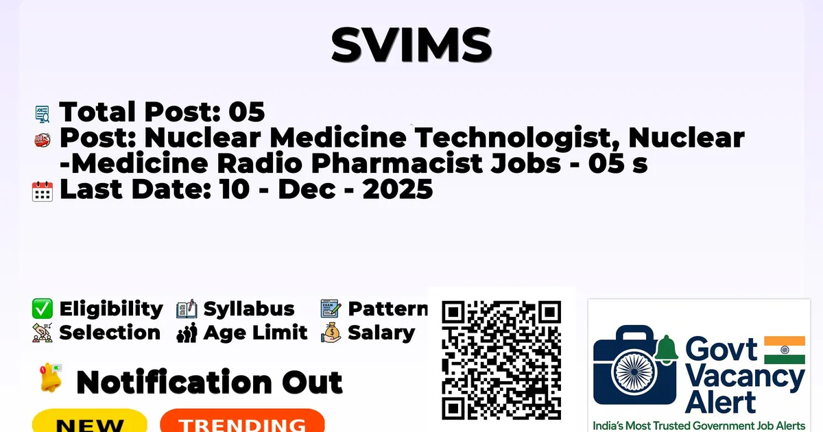 The Sri Venkateswara Institute of Medical Sciences (SVIMS) has officially released the notification to fill the vacancies of 05 Nuclear Medicine Technologists, Nuclear Medicine Radio Pharmacist Jobs. Interested and eligibile candidates can use this opportunity to apply for these posts before the last date of application. Candidates who have completed their B.Sc., M.Sc., PGDM, and M. Pharm can apply for the SVIMS Notification 2025. The interested applicants can attend the walk-in interview. Here we have mentioned the education details, age limit, selection process, application fee, salary, and how to apply for these posts before the deadline. The application dates have already begun.