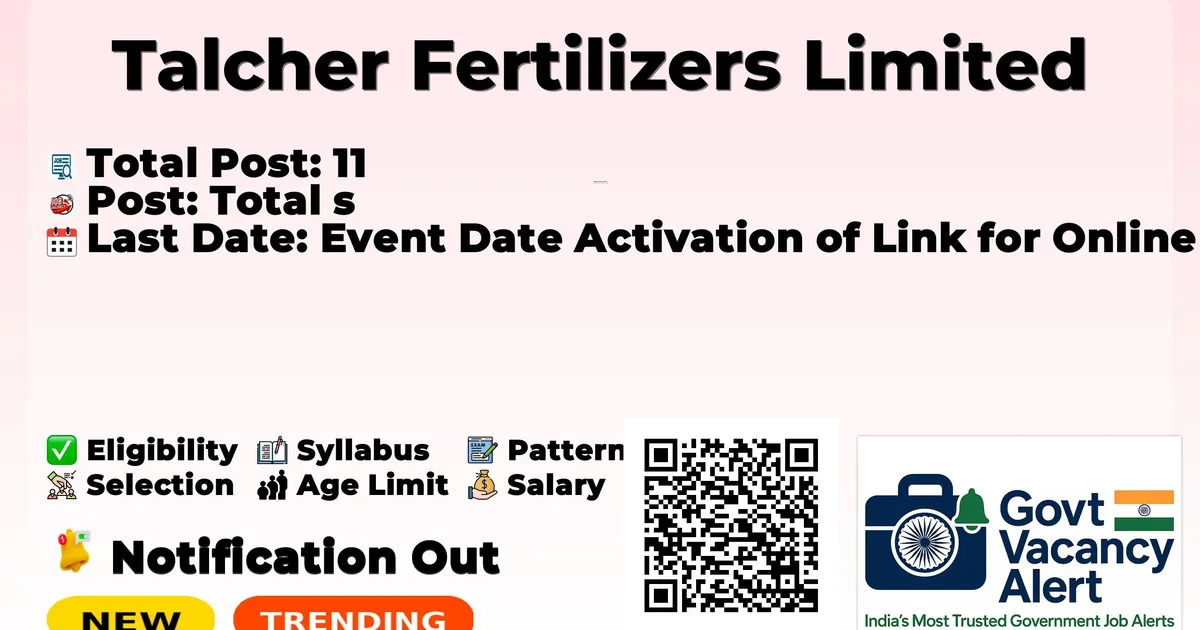 Company Name Talcher Fertilizers Limited Post Name Chief Manager / Manager No of Posts 11 Advt No TFL/RECT/EXE/02/2025 Salary E-5: ₹80,000 - ₹2,20,000; E-3: ₹60,000 - ₹1,80,000 Qualification BE/BTech in relevant discipline, MBA/PG Diploma, CA/ICMA, etc. depending on the post. Age Limit Max 45 years for Chief Manager, Max 35 years for Manager (with relaxations) Last Date 27-04-2026 Apply Mode Online Job Type Full Time