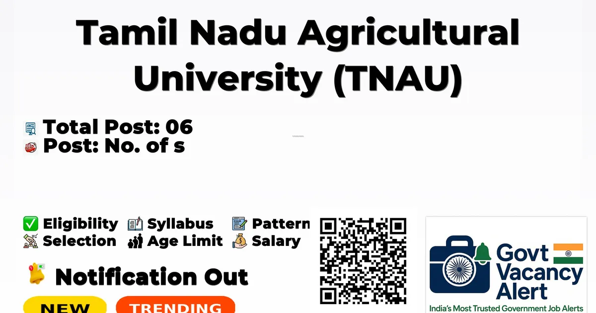 Tamil Nadu Agricultural University (TNAU) Recruitment 2026 for 06 posts of SRF, Library Assistant and More. Candidates with M.Sc, M.E/M.Tech, M.Phil/Ph.D Can attend the walkin. The Walk-in on 07-01-2026. For detailed information please visit TNAU official website, tnau.ac.in.