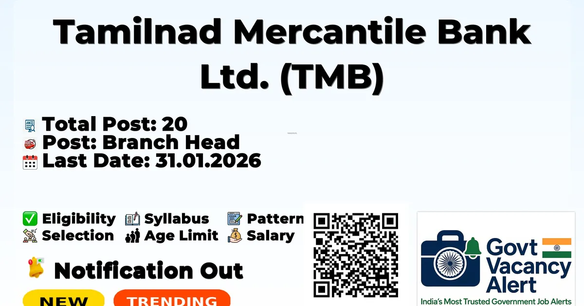 Tamilnad Mercantile Bank (TMB) has released an official notification for the recruitment of 20 Branch Head Posts. Interested and eligible candidates can apply Online through the official TMB website. The last date to submit the application form is 31-01-2026. In this article, you’ll find the TMB Branch Head Posts recruitment details, including eligibility criteria, age limit, salary structure, selection process, application steps, and direct links to the official notification and Online application form.