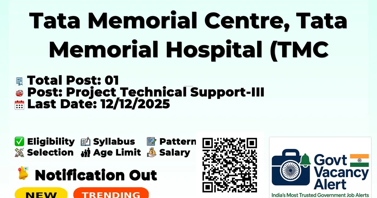 Tata Memorial Centre (TMC TMH) has released an official notification for the recruitment of 01 Project Technical Support III Posts. Interested and eligible candidates can apply Online through the official TMC TMH website. The last date to submit the application form is 12-12-2025. In this article, you’ll find the TMC TMH Project Technical Support III Posts recruitment details, including eligibility criteria, age limit, salary structure, selection process, application steps, and direct links to the official notification and Online application form.