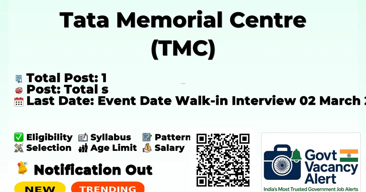 Company Name Tata Memorial Centre (TMC) Post Name Clinical Psychologist No of Posts 1 Advt No TMC/AD/35/2026 Salary Rs. 41,000 p.m. Qualification MA/MSc in Psychology with Two years of Experience in Conducting Tobacco Cessation Age Limit 30 Years Last Date 12.03.2026 Walk-in Date 12-03-2026 Apply Mode Walk-in Job Type Contract