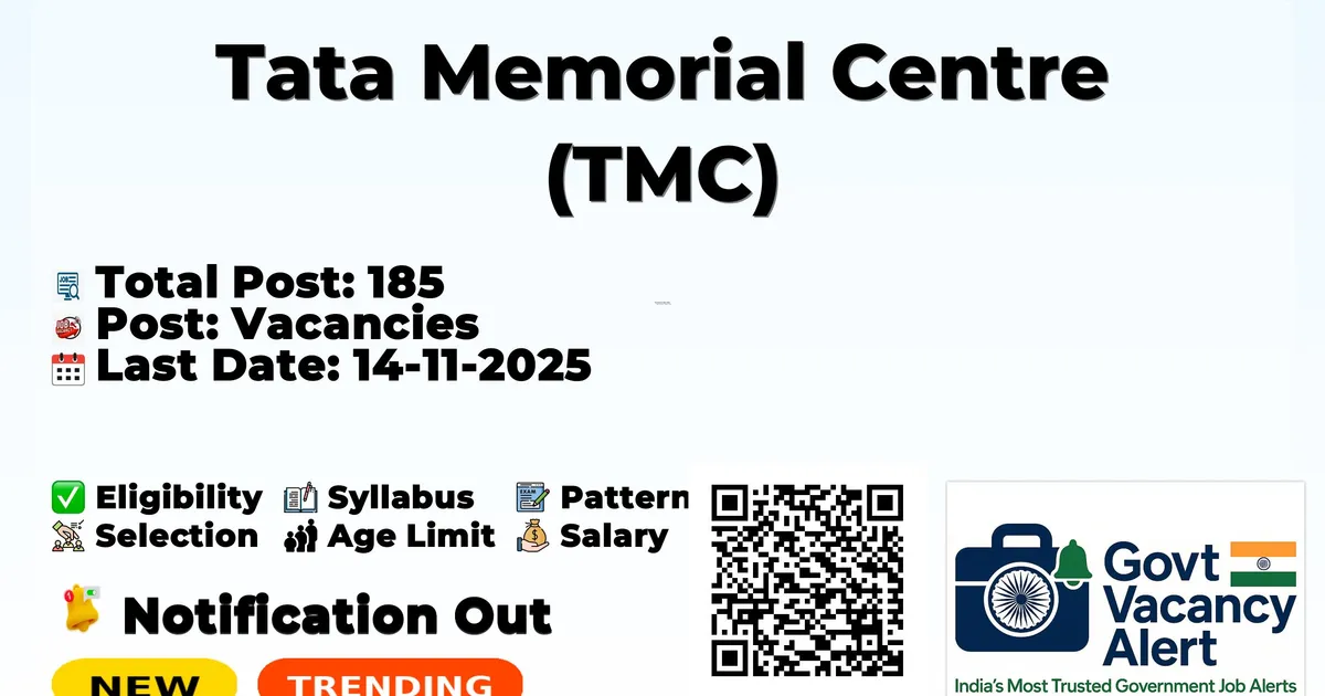 Company Name Tata Memorial Centre (TMC) Post Name Nurse, Cook and Other No of Posts 185 Pay Matrix Rs 19,900 to 44,900 Qualification Any Graduate, Diploma, 10TH, GNM Age Limit 45 years Start Date for Apply Online 30-10-2025 Last Date for Apply Online 14-11-2025 Official Website tmc.gov.in