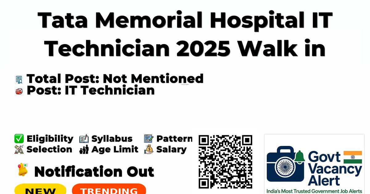 Tata Memorial Hospital Recruitment 2025 for posts of IT Technician. Candidates with Diploma Can attend the walkin. The Walk-in on 29-10-2025. For detailed information please visit Tata Memorial Hospital official website, tmc.gov.in.