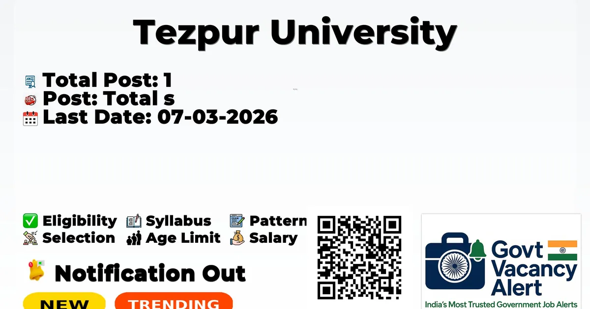 Tezpur University has released an official notification for the recruitment of 01 Junior Research Fellow Posts. Interested and eligible candidates can apply Online through the official Tezpur University website. The last date to submit the application form is 07-03-2026. In this article, you’ll find the Tezpur University Junior Research Fellow Posts recruitment details, including eligibility criteria, age limit, salary structure, selection process, application steps, and direct links to the official notification and Online application form.