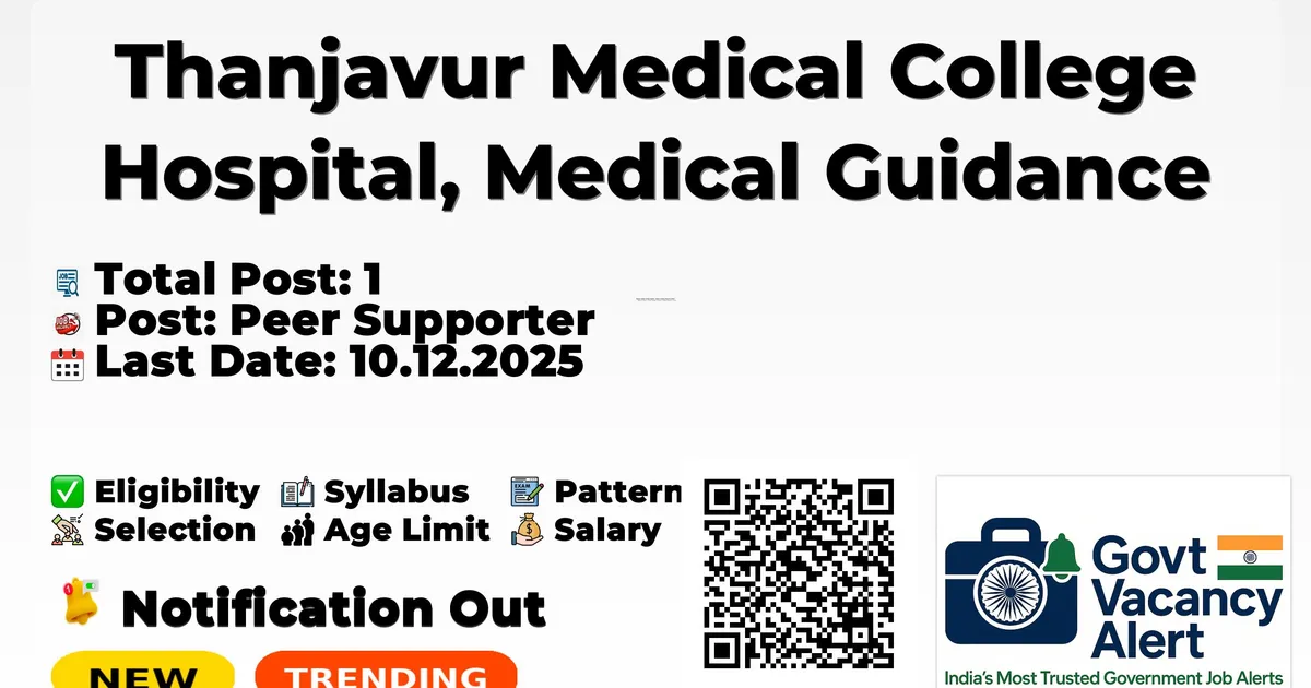 Thanjavur Medical College Hospital has released an official notification for the recruitment of 01 Peer Supporter Posts. Interested and eligible candidates can apply Offline through the official Thanjavur Medical College Hospital website. The last date to submit the application form is 10-12-2025. In this article, you’ll find the Thanjavur Medical College Hospital Peer Supporter Posts recruitment details, including eligibility criteria, age limit, salary structure, selection process, application steps, and direct links to the official notification and Offline application form.
