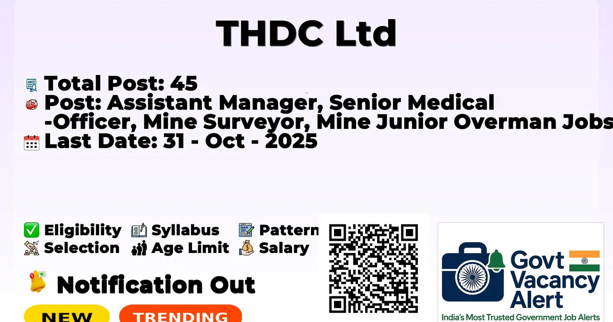 The Teri Hydro Development Corporation Limited (THDC) has officially released the notification to fill up 45 Assistant Manager, Senior Medical Officer, Mine Surveyor, and Mine Junior Overman Jobs. Interested and eligible candidates can use this opportunity to apply for these posts before the last date of application. Candidates who have completed their MBBS, Diploma, B.E./B. Tech in Civil. Electrical, Mechanical Engineering candidates can apply for the THDC Recruitment 2025. The interested applicants can apply in online mode. Here we have mentioned the education details, age limit, selection process, application fee, salary, and how to apply for these posts before the deadline. The application dates have already begun.
