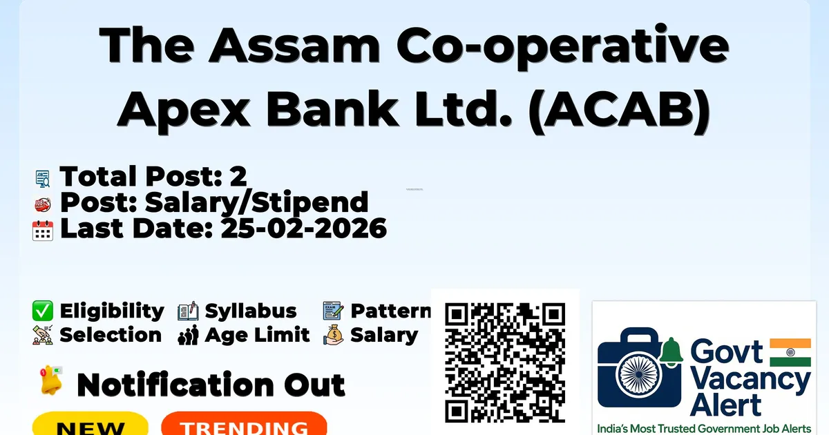 Company Name The Assam Co-operative Apex Bank Ltd. (ACAB) Post Name Domain Expert (Agri. Marketing/Value Addition & Processing), Domain Expert (Accounts) No of Posts 2 Advt No 02/2026 Salary Rs. 35,000/- Per Month Rs. 35,000/- Per Month Qualification MBA / B.Com Age Limit 25 to 40 years Notification Date 07-02-2026 Last Date for Apply 25-02-2026 Apply Mode Offline Job Type Contract Official Website www.acab.bank.in