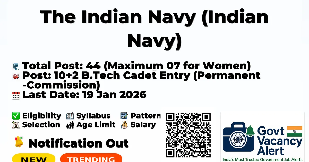 Company Name The Indian Navy (Indian Navy) Post Name 10+2 B.Tech Cadet Entry (Permanent Commission) No of Posts 44 (Maximum 07 for Women) Qualification Senior Secondary (10+2) with 70% in PCM and 50% in English Age Limit Born between 02 Jan 2007 and 01 Jul 2009 Start Date for Apply 03 Jan 2026 Last Date for Apply 19 Jan 2026 Official Website www.joinindiannavy.gov.in