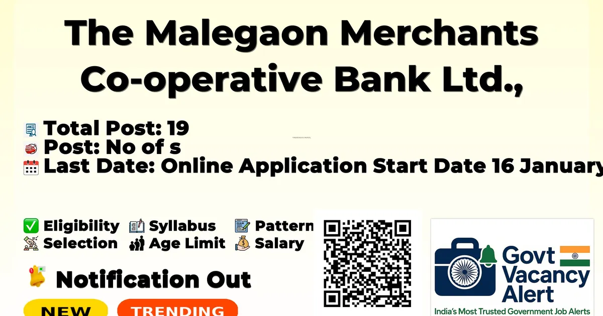 Malegaon Merchants Co-op Bank has released an official notification for the recruitment of 19 Clerk Posts. Interested and eligible candidates can apply Online through the official Malegaon Merchants Co-op Bank website. The last date to submit the application form is 27-01-2026. In this article, you’ll find the Malegaon Merchants Co-op Bank Clerk Posts recruitment details, including eligibility criteria, age limit, salary structure, selection process, application steps, and direct links to the official notification and Online application form.