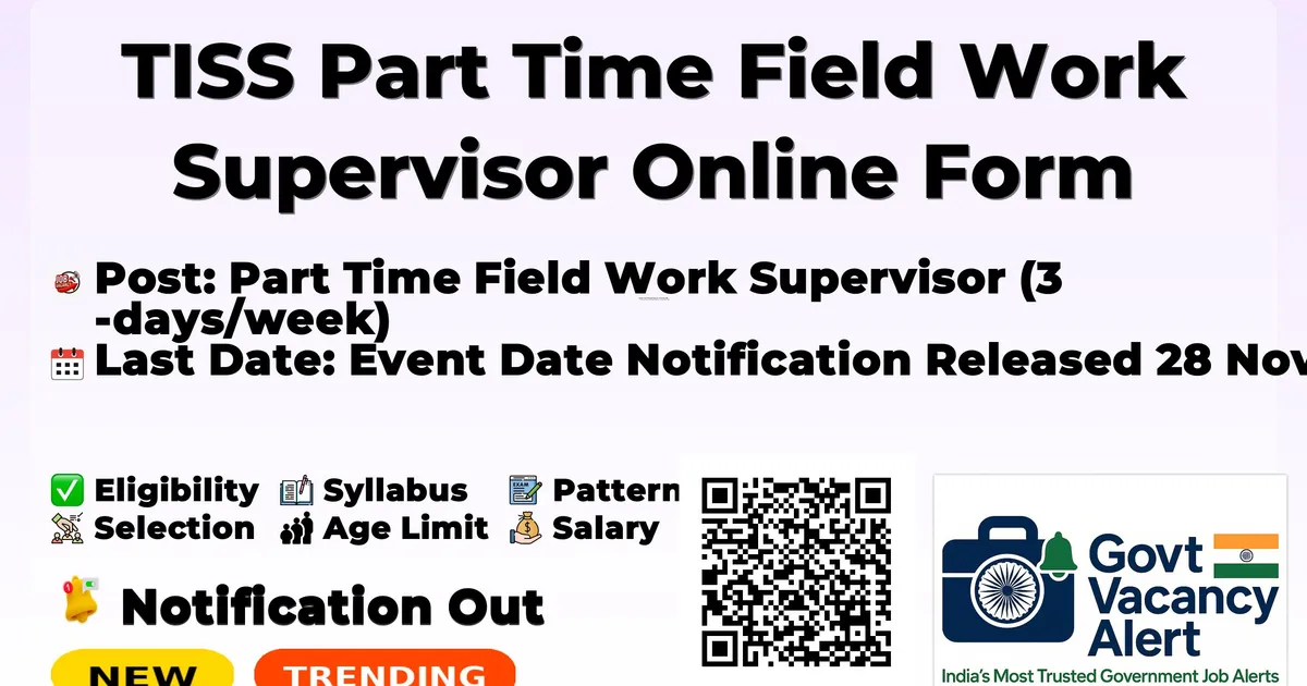 Tata Institute of Social Sciences (TISS) has released an official notification for the recruitment of 02 Part Time Field Work Supervisor Posts. Interested and eligible candidates can apply Online through the official TISS website. The last date to submit the application form is 10-12-2025. In this article, you’ll find the TISS Part Time Field Work Supervisor Posts recruitment details, including eligibility criteria, age limit, salary structure, selection process, application steps, and direct links to the official notification and Online application form. Join Arattai Channel Trending Govt Jobs RRB NTPC 12TH Level Online Form 2025 3058 Post Intelligence Bureau (IB) 362 MTS Online Form 2025 RRB 2569 JE (Junior Engineer) Online Form 2025 KVS and NVS 14967 Teaching and Non Teaching Online Form 2025 AIIMS 1383 CRE Online Form 2025 Advertisement Institute Tata Institute of Social Sciences (TISS), Mumbai Post Name Part Time Field Work Supervisor (3 days/week) No. of Posts 02 Consolidated Salary ₹20,000/- per month Location TISS Mumbai Campus, Deonar Last Date 10 December 2025 Mode of Application Via Email only Master’s Degree in Social Work (MSW) from a recognized university Minimum 3 years of work experience after MSW Preference will be given to candidates having prior experience of supervising BSW and MSW fieldwork students Experience in any of the following themes will be an added advantage: Community Organization and Development Practice Health and Mental Health Criminology and Justice Dalit and Tribal Studies Equity for Children and Families Women Centred Practice Disability Studies and Action Livelihoods and Social Innovation Event Date Notification Released 28 November 2025 Last Date for Application 10 December 2025 Interview (expected) Third week of December 2025 Joining Within 15 days of selection Consolidated monthly salary: ₹20,000/- Part-time role – required to be present only on Monday, Tuesday & Friday No additional allowances Shortlisting based on qualification & experience Personal Interview (offline/online – to be informed) No TA/DA will be paid for attending interview Official Notification PDF: Click here Official Website: Click here Join Arattai Channel: Click Here Join Telegram Channel: Click Here Join WhatsApp Channel: Click Here Sarkari Result: Click Here Download Mobile App: Click Here Jobs In Maharashtra Ahmednagar Akola Amravati Aurangabad Beed Bhandara Bid Buldhana Chandrapur Dhule Gadchiroli Gondia Hingoli Jalgaon Jalna Kolhapur Latur Lonavala Mahabaleshwar Mumbai Mumbai Suburban Nagpur Nanded Nandurbar Nasik Navi Mumbai Osmanabad Parbhani Pune Raigarh Ratnagiri Sangli Satara Sindhudurg Solapur Thane Wardha Washim Yavatmal Also Read SEBI Recruitment 2025 - Officer Grade A (Assistant Manager) Vacancies - Rs 62500 to 126100 Salary - Apply Now AIIMS CRE Recruitment 2025 - 1300+ Group B and Group C Posts - Apply Link Click Here RRB Recruitment 2025 - 2500+ JE (Junior Engineer) Vacancies - 35400 Monthly Salary - Apply Now Jobs By Education 10TH Jobs› 8TH Jobs› 12TH Jobs› Diploma Jobs› ITI Jobs› B.Tech/B.E Jobs› B.com Jobs› Any Graduate Jobs› Any Post Graduate Jobs› RRB Group D Admit Card 2025 EMRS Teaching and NonTeaching Admit Card 2025 Delhi Police Head Constable (Ministerial) Admit Card 2025 ONGC 2623 Apprentices Online Form 2025 IOCL 2,756 Apprentices Online Form 2025 Maharashtra 15631 Police Constable Online Form 2025 RRB NTPC 12TH Level Online Form 2025 3058 Post Intelligence Bureau (IB) 362 MTS Online Form 2025 RRB 2569 JE (Junior Engineer) Online Form 2025 1. What is the starting date to apply online for TISS Part Time Field Work Supervisor 2025? Ans: Starting Date to apply online is 28-11-2025. 2. What is the last online apply date for TISS Part Time Field Work Supervisor 2025? Ans: Last online apply date is 10-12-2025. 3. What is the Eligibility to apply for TISS Part Time Field Work Supervisor 2025? Ans: BSW, MSW 4. How many vacancies are being recruited by TISS Part Time Field Work Supervisor 2025? Ans: Total 02 Vacancies.