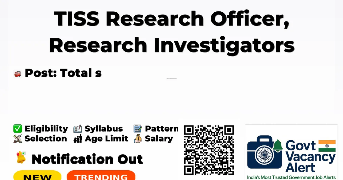 Details Information Organization Name Tata Institute of Social Sciences, Tuljapur Off-Campus (TISS) Post Name Research Officer, Research Associate, Research Investigators Total Vacancies 7 Posts Salary/Pay Scale Research Officer: Rs. 35,000/- pm; Research Associate: Rs. 30,000/- pm; Research Investigator: Rs. 10,000/- pm (all consolidated) + travel expenses during data collection by public transport Educational Qualification PG in Sociology/Social Work/Tribal-DNT Studies or related (for RO/RA) and Graduate/PG in Social Sciences/Social Work (for Investigators) as detailed in eligibility criteria Age Limit RO: preferably below 45 years; RA: preferably below 40 years; no specific age limit for Investigators Application Start Date 28/11/2025 Application End Date 13/12/2025 Application Mode Online via Google Form (link in advertisement) Official Website www.tiss.edu
