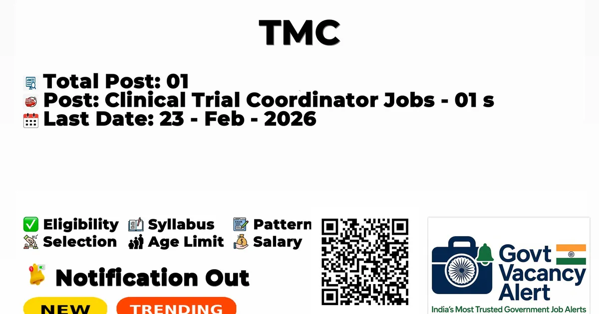 The Tata Memorial Centre (TMC) has declared the official notification for the various Clinical Trial Coordinator Jobs. Those candidates who have qualified in the M.Pharm or B. Pharm can use this opportunity and apply for the TMC Notification 2026. Here, we included more information about the age limit, selection process, salary structure, education details, application fee, and how to apply for these posts. Interested candidates can attend the walk-in at the address below.