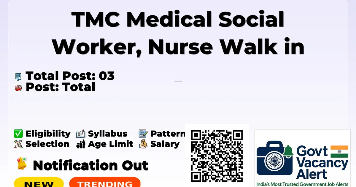 Tata Memorial Centre (TMC) Recruitment 2025 for 03 posts of Medical Social Worker, Nurse. Candidates with Any Graduate, B.A, B.Sc, BSW, M.A Can attend the walkin. The Walk-in on 27-10-2025. For detailed information please visit TMC official website, tmc.gov.in.
