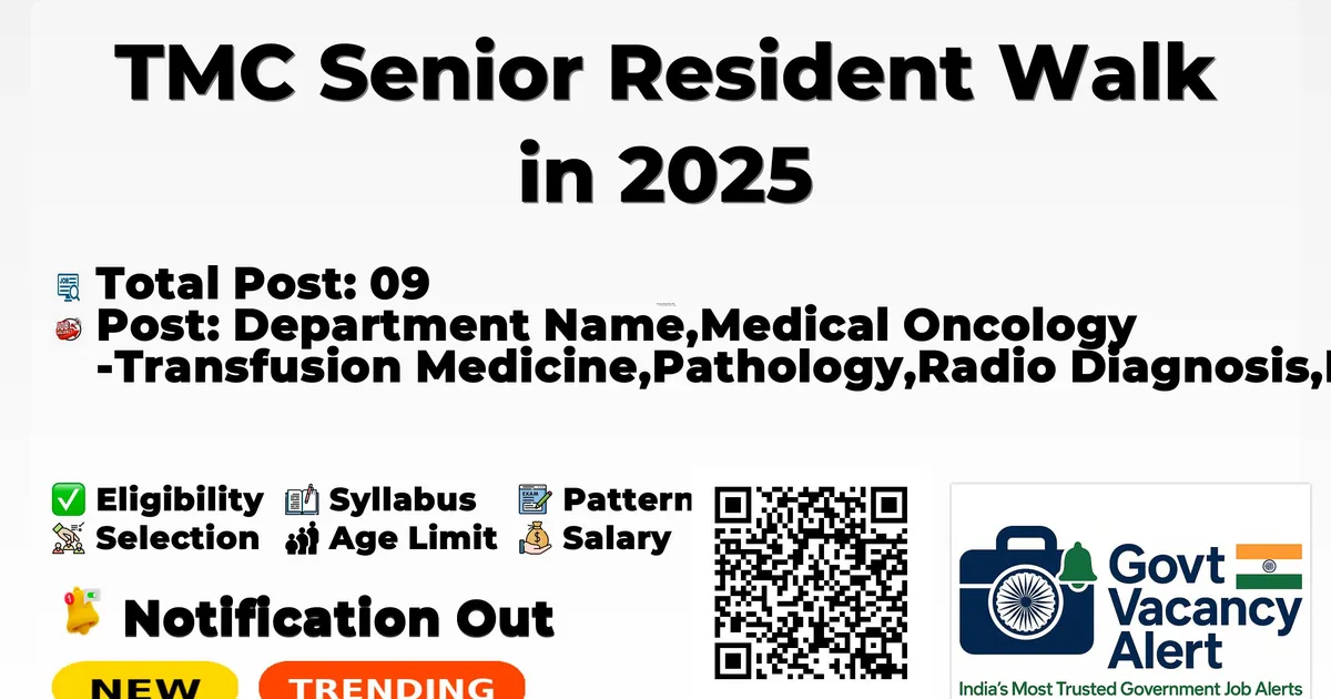 Tata Memorial Centre (TMC) Recruitment 2025 for 09 posts of Senior Resident. Candidates with DNB, MS/MD Can attend the walkin. The Walk-in on 19-11-2025. For detailed information please visit TMC official website, tmc.gov.in.
