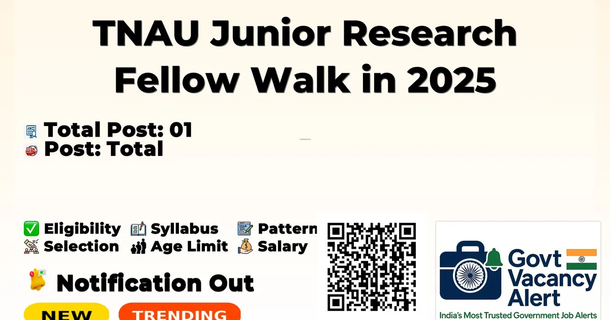 Tamil Nadu Agricultural University (TNAU) Recruitment 2025 for 01 posts of Junior Research Fellow. Candidates with B.Sc Can attend the walkin. The Walk-in on 18-11-2025. For detailed information please visit TNAU official website, tnau.ac.in.