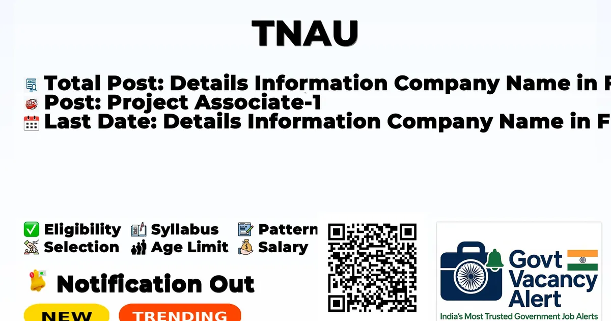 Last Date: Details Information Company Name in Full Form Tamil Nadu Agricultural University Company Name in Short Form TNAU Post Name Project Associate-1 Notification Date mm/dd/yyyy 11/20/2025 Total Vacancy Count 1 Qualification M.E./M.Tech. in Soil and Water Conservation / Irrigation and Drainage Engineering / Hydrology and Water Resource Engineering (with four years Bachelor degree from SAU/CAU/IIT/Govt. Universities) Start Date mm/dd/yyyy 11/20/2025 Last Date mm/dd/yyyy Walk-in Interview: 11/26/2025 Walkin Date mm/dd/yyyy 11/26/2025 Official Website https://tnau.ac.in Minimum Salary 30,000 + HRA Maximum Salary 31,000 + HRA Salary Unit Per month Pincode 628502 Address Agricultural Research Station, Kovilpatti Job Type Full Time Official Website https://tnau.ac.in