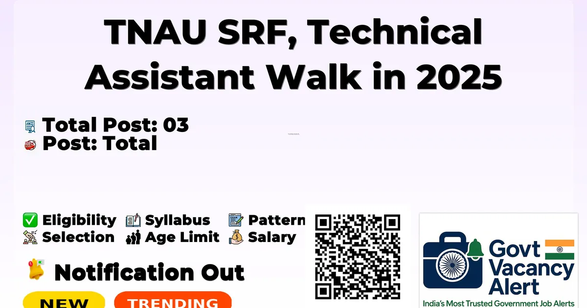 Tamil Nadu Agricultural University (TNAU) Recruitment 2025 for 03 posts of SRF, Technical Assistant. Candidates with Diploma, M.Sc Can attend the walkin. The Walk-in on 20-11-2025. For detailed information please visit TNAU official website, tnau.ac.in.