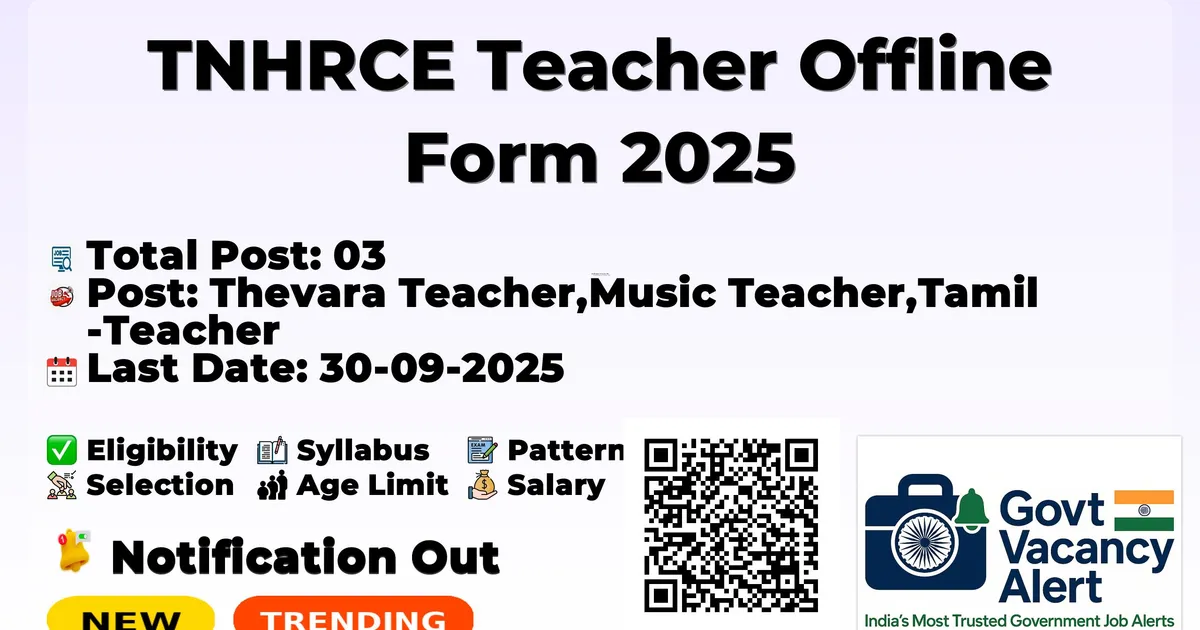 The Tamil Nadu Hindu Religious Endowments Department (TNHRCE) Recruitment 2025 for 03 posts of Teacher. Candidates with Any Bachelors Degree Can Apply Offline. The Offline application opens on 08-09-2025, and closes on 30-09-2025. The candidate shall apply Offline through TNHRCE website, hrce.tn.gov.in.