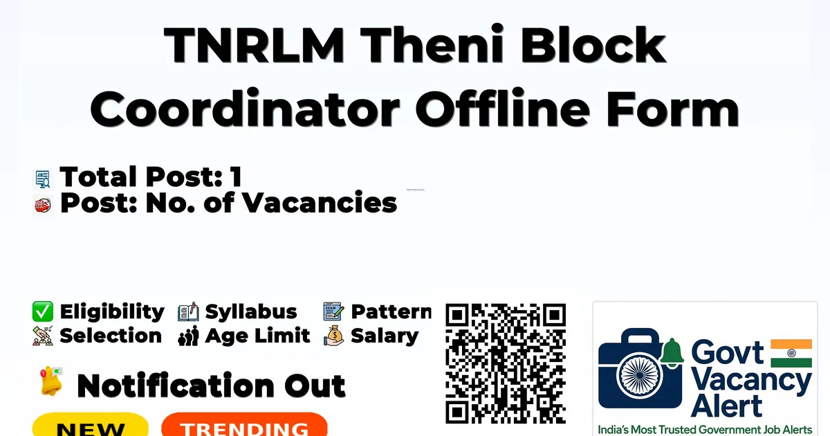 Tamil Nadu State Rural Livelihood Mission (TNRLM Theni) has released an official notification for the recruitment of 01 Block Coordinator Posts. Interested and eligible candidates can apply Offline through the official TNRLM Theni website. The last date to submit the application form is 16-02-2026. In this article, you’ll find the TNRLM Theni Block Coordinator Posts recruitment details, including eligibility criteria, age limit, salary structure, selection process, application steps, and direct links to the official notification and Offline application form.
