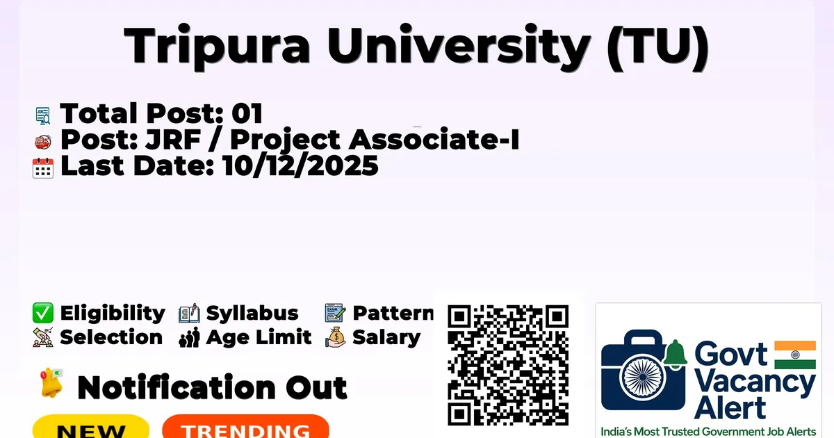 Tripura University has released an official notification for the recruitment of 01 JRF/ Project Associate I Posts. Interested and eligible candidates can apply Online through the official Tripura University website. The last date to submit the application form is 10-12-2025. In this article, you’ll find the Tripura University JRF/ Project Associate I Posts recruitment details, including eligibility criteria, age limit, salary structure, selection process, application steps, and direct links to the official notification and Online application form. Join Us on Add us on WhatsApp Telegram Arattai Trending Govt Jobs SSC 25487 GD Constable Online Form 2025 DRDO CEPTAM 11 764 STA-B, Tech-A Online Form 2025 KVS and NVS 14967 Teaching and Non Teaching Online Form 2025 RRB 2569 JE (Junior Engineer) Online Form 2025 Intelligence Bureau (IB) 362 MTS Online Form 2025 Advertisement Company Name Tripura University (TU) Post Name JRF / Project Associate-I No of Posts 01 Salary Rs. 37,000/- + HRA (1st & 2nd year), Rs. 42,000/- + HRA (3rd year onwards) OR as per DST norms for Project Associate-I Qualification M.Sc. in Chemical Science Age Limit Not Specified Start Date for Apply 04/12/2025 Last Date for Apply 10/12/2025 Official Website www.tripurauniv.ac.in Sl. No. Post Name No. of Posts 1 JRF / Project Associate-I 01 Essential Qualification: M.Sc. in Chemical Science (candidate who are interested to work in the field of chemistry-biology interphase as the project is on organic synthesis-medicinal chemistry applications), as per DST norms Desirable: Prior experience in organic synthesis of small molecules, heterocyclic and peptide synthesis, purifications and characterization. Prior experience in medicinal chemistry research. JRF: Rs. 37,000/- + HRA (1st & 2nd year) SRF (from 3rd year): Rs. 42,000/- + HRA Project Associate-I: As per DST Norms Event Date Notification Date 04/12/2025 Last Date to Send Application (via Email) 10/12/2025 Walk-in-Interview Date & Time 11/12/2025 at 11:00 AM Walk-in-Interview (Offline/Online on request) Shortlisting based on application and qualifications Candidates must send complete Bio-data (with valid phone number) along with self-attested copies of testimonials, certificates, and mark sheets as a single PDF via email to: [email protected] Last date for submission of application: 10/12/2025 Shortlisted candidates will be informed via email Appear for Walk-in-Interview on 11/12/2025 at 11:00 AM in the Department of Chemistry, Tripura University Online interview may be allowed on request Position is purely temporary and co-terminus with the project (Till June 2028) Initial appointment for 1 year, extendable based on satisfactory performance No TA/DA will be paid for attending the interview Selected candidate may register for PhD program subject to fulfillment of institutional criteria Official Notification PDF: Click here Official Website: Click here Join Arattai Channel: Click Here Join Telegram Channel: Click Here Join WhatsApp Channel: Click Here Sarkari Result Vacancy: Click Here Download Mobile App: Click Here Follow Us on Add us on Google News Twitter Jobs In Tripura Agartala Dhalai North Tripura South Tripura Unakoti West Tripura Also Read Territorial Army Rally Recruitment 2025 - 1500+ Vacancies - 8TH, 10TH, 12TH Pass Candidates Can Apply SAIL MT Recruitment 2025 - 100+ Vacancies - Across india - 50000-160000 Salary - Apply Now RRB Recruitment 2025 - 2500+ JE (Junior Engineer) Vacancies - 35400 Monthly Salary - Apply Now Jobs By Education 10TH Jobs› 8TH Jobs› 12TH Jobs› Diploma Jobs› ITI Jobs› B.Tech/B.E Jobs› B.com Jobs› Any Graduate Jobs› Any Post Graduate Jobs› SSC 25487 GD Constable Online Form 2025 IAF 144 Apprentice Online Form 2025 SSC CPO SI Admit Card 2025 KVS and NVS 14967 Teaching and Non Teaching Online Form 2025 RRB 2569 JE (Junior Engineer) Online Form 2025 Intelligence Bureau (IB) 362 MTS Online Form 2025 SBI 996 SCO Online Form 2025 UP 41424 Home Guard Online Form 2025 UPSSSC PET Result 2025 1. What is the starting date to apply online for Tripura University JRF/ Project Associate I 2025? Ans: Starting Date to apply online is Available Soon. 2. What is the last online apply date for Tripura University JRF/ Project Associate I 2025? Ans: Last online apply date is 10-12-2025. 3. What is the Eligibility to apply for Tripura University JRF/ Project Associate I 2025? Ans: M.Sc 4. How many vacancies are being recruited by Tripura University JRF/ Project Associate I 2025? Ans: Total 01 Vacancies.