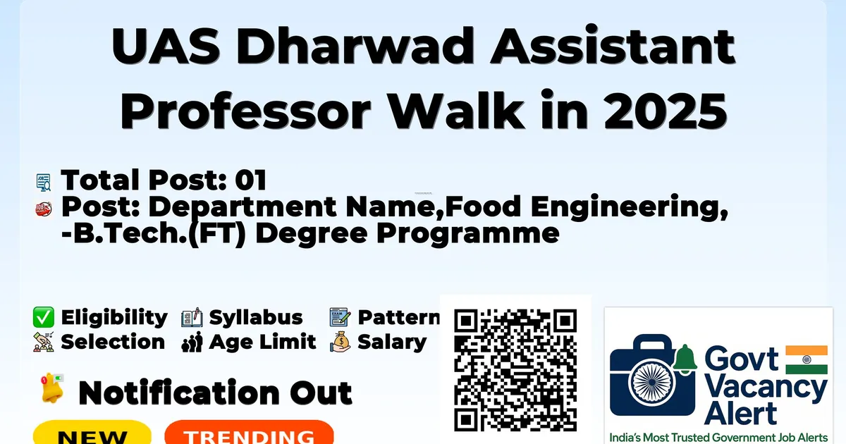 University of Agricultural Sciences (UAS Dharwad) Recruitment 2025 for 01 posts of Assistant Professor. Candidates with M.E/M.Tech Can attend the walkin. The Walk-in on 13-11-2025. For detailed information please visit UAS Dharwad official website, uasd.edu.