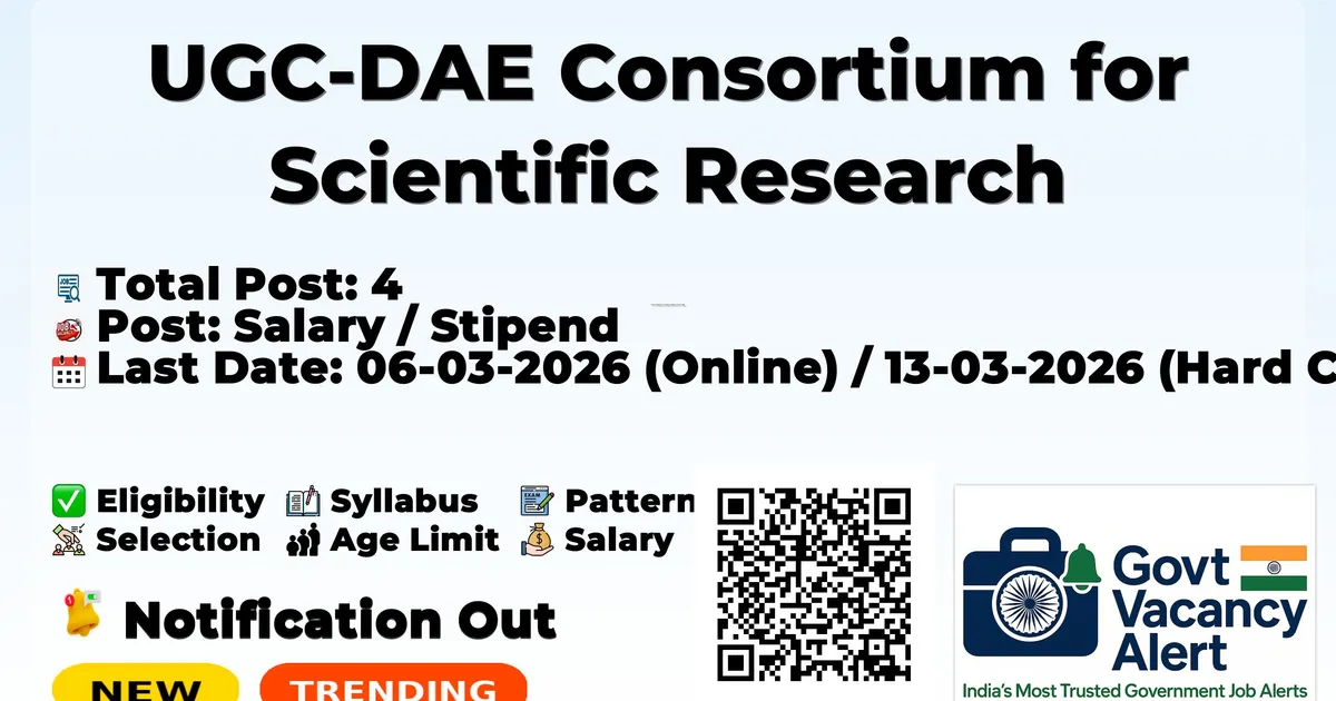 UGC-DAE Consortium for Scientific Research (UGC DAE CSR) has released an official notification for the recruitment of 04 Assistant, Clerk Typist and More Posts. Interested and eligible candidates can apply Online through the official UGC DAE CSR website. The last date to submit the application form is 06-03-2026. In this article, you’ll find the UGC DAE CSR Assistant, Clerk Typist and More Posts recruitment details, including eligibility criteria, age limit, salary structure, selection process, application steps, and direct links to the official notification and Online application form.