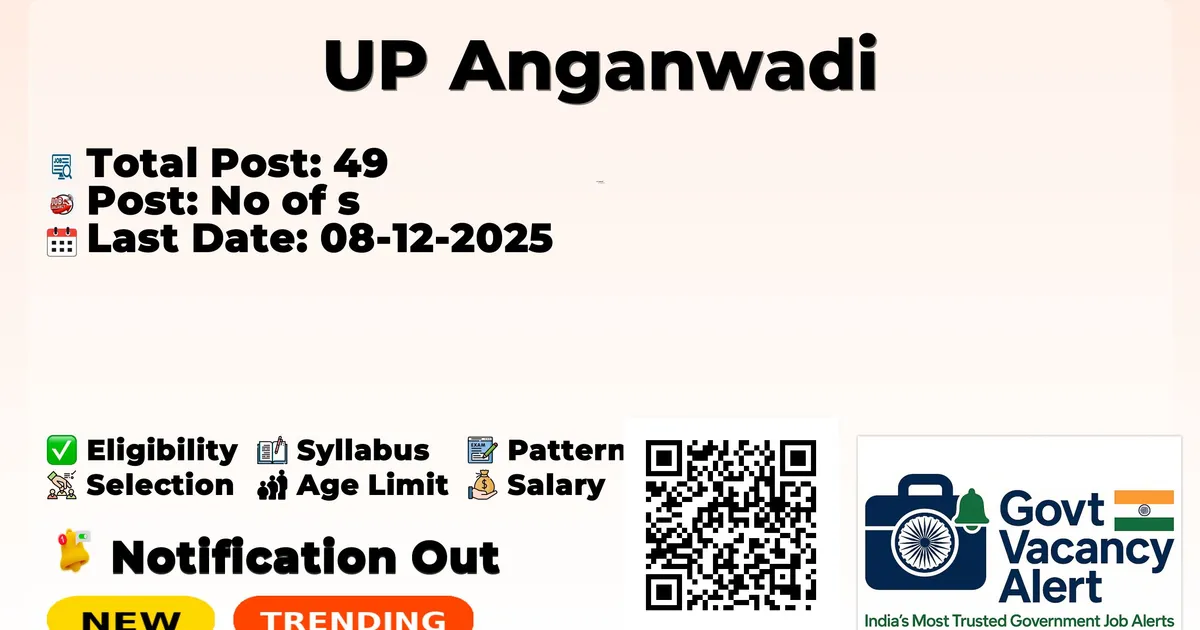 Company Name UP Anganwadi Post Name Anganwadi Worker No of Posts 49 Qualification 12TH Pass Age Limit 18 to 35 years Start Date for Apply Online 15-11-2025 Last Date for Apply Online 08-12-2025 Official Website upanganwadibharti.in