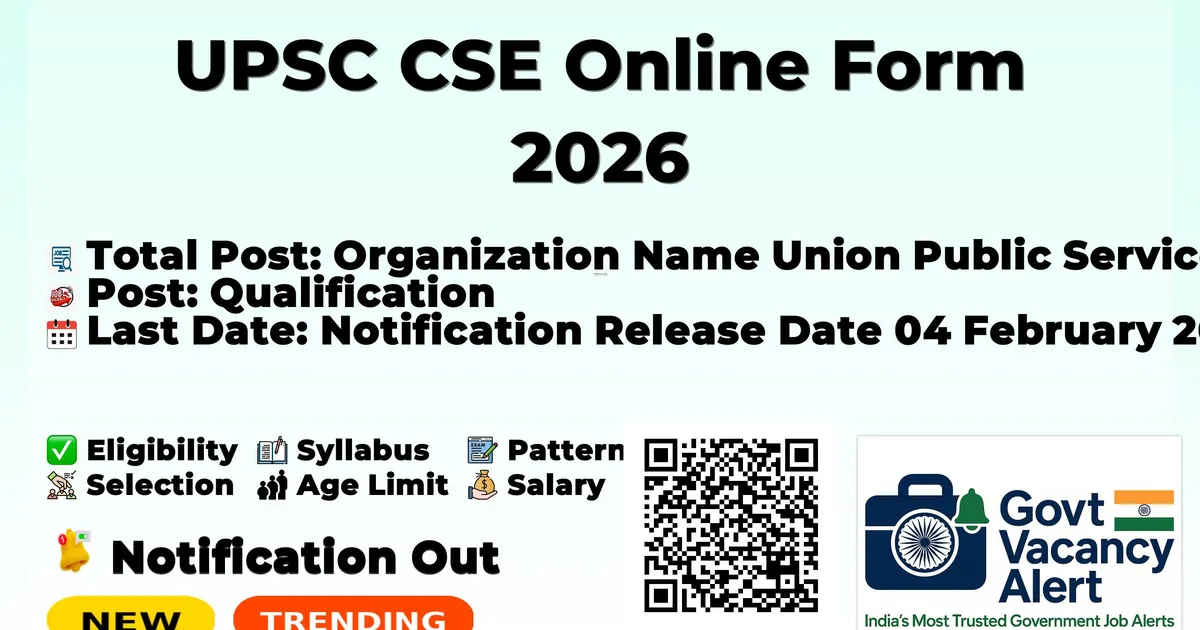 Organization Name Union Public Service Commission (UPSC) Exam Name Civil Services Examination (CSE) 2026 Post Type Group A & Group B Services Total Vacancy Count Approximately 933 Posts Services Covered IAS, IPS, IFS, IRS, Indian Audit & Accounts, DANICS, DANIPS, and Other Central Services Qualification Graduate Degree (Any Discipline) Age Limit 21–32 Years (as on 01-08-2026) Exam Stages Preliminary, Main, Interview Apply Online Start Date 04/02/2026 Apply Online Last Date 24/02/2026 (6:00 PM) Apply Mode Online Official Website www.upsc.gov.in