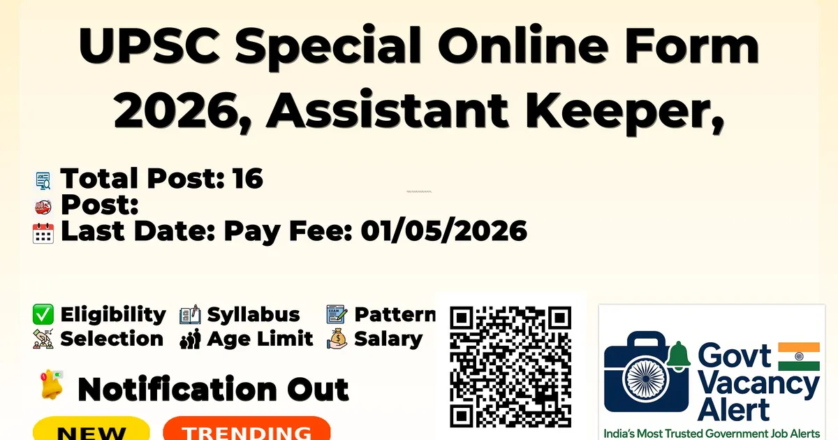 UPSC Recruitment 2026: Union Public Service Commission (UPSC) are invited to apply online application form for for direct recruitment by selection to 16 posts across three Central Government departments — Anthropological Survey of India (Ministry of Culture), Defence Research & Development Organisation (DRDO), and Department of Animal Husbandry & Dairying. Other information related to this recruitment like selection procedure, pay scale, age limit, syllabus information is available in the notification (UPSC Special Online Form 2026, Assistant Keeper, Senior Store Officer).