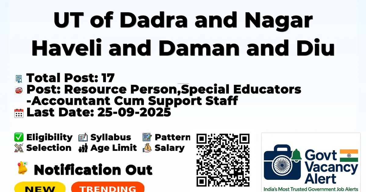 The UT of Dadra and Nagar Haveli and Daman and Diu Recruitment 2025 for 17 posts of Special Educators, Resource Person and Other. Candidates with Any Graduate, B.A, B.Com, B.Ed, B.Sc, Diploma, PG Diploma Can Apply Offline. The Offline application opens on 08-09-2025, and closes on 25-09-2025. The candidate shall apply Offline through UT of Dadra and Nagar Haveli and Daman and Diu website, ddd.gov.in.