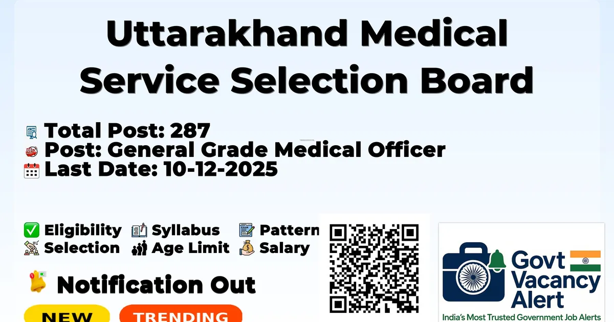 Company Name Uttarakhand Medical Service Selection Board (UKMSSB) Post Name General Grade Medical Officer No of Posts 287 Salary Rs 56,100 to 1,77,500 (Level 10) Qualification MBBS, M.Phil/Ph.D, MS/MD, M.Ch, DM Age Limit 21 to 42 years Start Date for Apply Online 20-11-2025 Last Date for Apply Online 10-12-2025 Official Website ukmssb.org