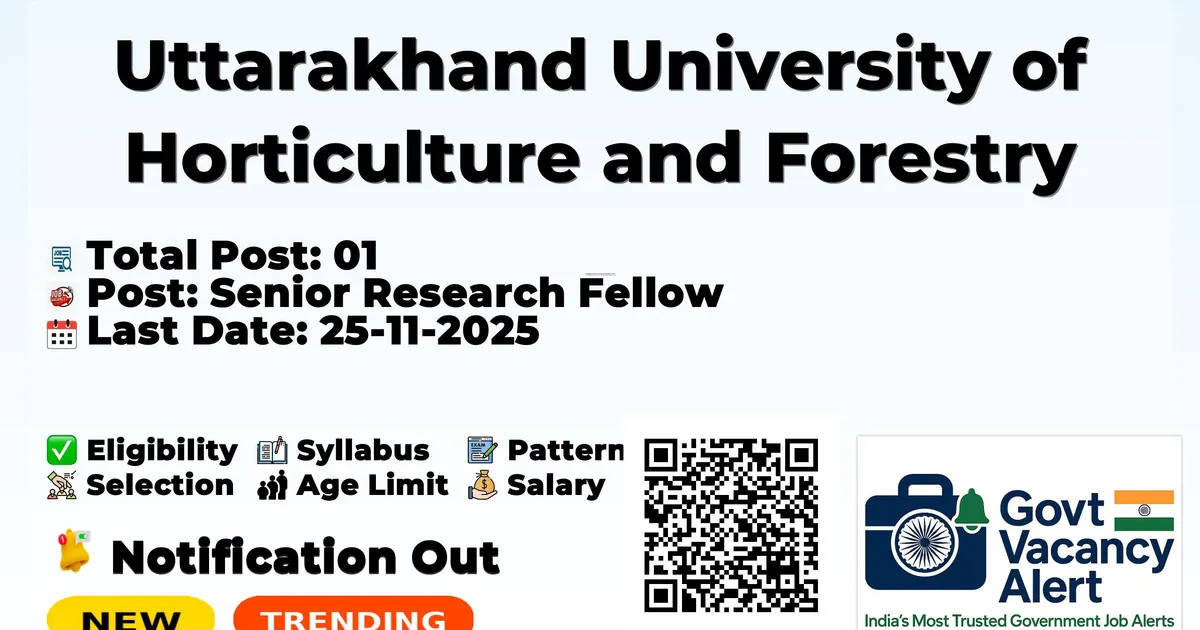 Uttarakhand University of Horticulture and Forestry (UUHF) has released an official notification for the recruitment of 01 Senior Research Fellow Posts. Interested and eligible candidates can apply Offline through the official UUHF website. The last date to submit the application form is 25-11-2025. In this article, you’ll find the UUHF Senior Research Fellow Posts recruitment details, including eligibility criteria, age limit, salary structure, selection process, application steps, and direct links to the official notification and Offline application form. Join Arattai Channel Trending Govt Jobs SAIL 124 Management Trainee (Tech) Online Form 2025 KVS and NVS Online Form 2025 RRB NTPC 5,810 Online Form 2025 Bank of Baroda 2700 Apprentices Online Form 2025 Intelligence Bureau (IB) ACIO II Tech Online Form 2025 Advertisement Company Name Uttarakhand University of Horticulture and Forestry (UUHF) Post Name Senior Research Fellow No of Posts 01 Salary Rs.37,000/- Qualification M.Sc Start Date for Apply 10-11-2025 Last Date for Apply 25-11-2025 Official Website uuhf.ac.in M.Sc. Agriculture/ Horticulture/ Forestry Rs. 37,000/- Per Month+ HRA as per rules. Starting Date for Apply: 10-11-2025 Last Date for Apply: 25-11-2025 The appointment shall be given on six monthly review basis. The candidate possessing desired qualifications may submit their application at the office of Officer In Charge, Krishi Vigyan Kendra, VCSG UUHF, Ranichauri, 249 199, Tehri Garhwal through post/by hand on before 05.00 pm on 25/11/2025. The details of post are given below. Official Notification PDF: Click here Official Website: Click here Join Arattai Channel: Click Here Join Telegram Channel: Click Here Join WhatsApp Channel: Click Here Sarkari Result: Click Here Download Mobile App: Click Here Jobs In Uttarakhand Almora Bageshwar Chamoli Champawat Dehradun Haldwani Haridwar Nainital Pauri Garhwal Pithoragarh Roorkee Rudraprayag Rudrapur Srinagar(Garhwal) Tehri Garhwal Udham Singh Nagar Uttarkashi Also Read SEBI Recruitment 2025 - Officer Grade A (Assistant Manager) Vacancies - Rs 62500 to 126100 Salary - Apply Now Intelligence Bureau ACIO II Tech Recruitment 2025 - 200+ Vacancies Across India - 44900-142400 Salary - Apply Now RRB Recruitment 2025 - 2500+ JE (Junior Engineer) Vacancies - 35400 Monthly Salary - Apply Now Jobs By Education 10TH Jobs› 8TH Jobs› 12TH Jobs› Diploma Jobs› ITI Jobs› B.Tech/B.E Jobs› B.com Jobs› Any Graduate Jobs› Any Post Graduate Jobs› Bank of Baroda 2700 Apprentices Online Form 2025 RRB 2569 JE (Junior Engineer) Online Form 2025 RRB NTPC 12TH Level Online Form 2025 3058 Post BRO 542 MSW, Vehicle Mechanic Offline Form 2025 Territorial Army 1529 Soldier Offline Form 2025 ONGC 2623 Apprentices Online Form 2025 BSSC 23175 Inter Level Online Form 2025 ISRO SDSC SHAR Various Vacancy Online Form 2025 RRB NTPC 8850 Online Form 202526 1. What is the starting date to apply for UUHF Senior Research Fellow 2025? Ans: Starting Date to apply is 10-11-2025. 2. What is the last apply date for UUHF Senior Research Fellow 2025? Ans: Last apply date is 25-11-2025. 3. What is the Eligibility to apply for UUHF Senior Research Fellow 2025? Ans: M.Sc 4. How many vacancies are being recruited by UUHF Senior Research Fellow 2025? Ans: Total 01 Vacancies.