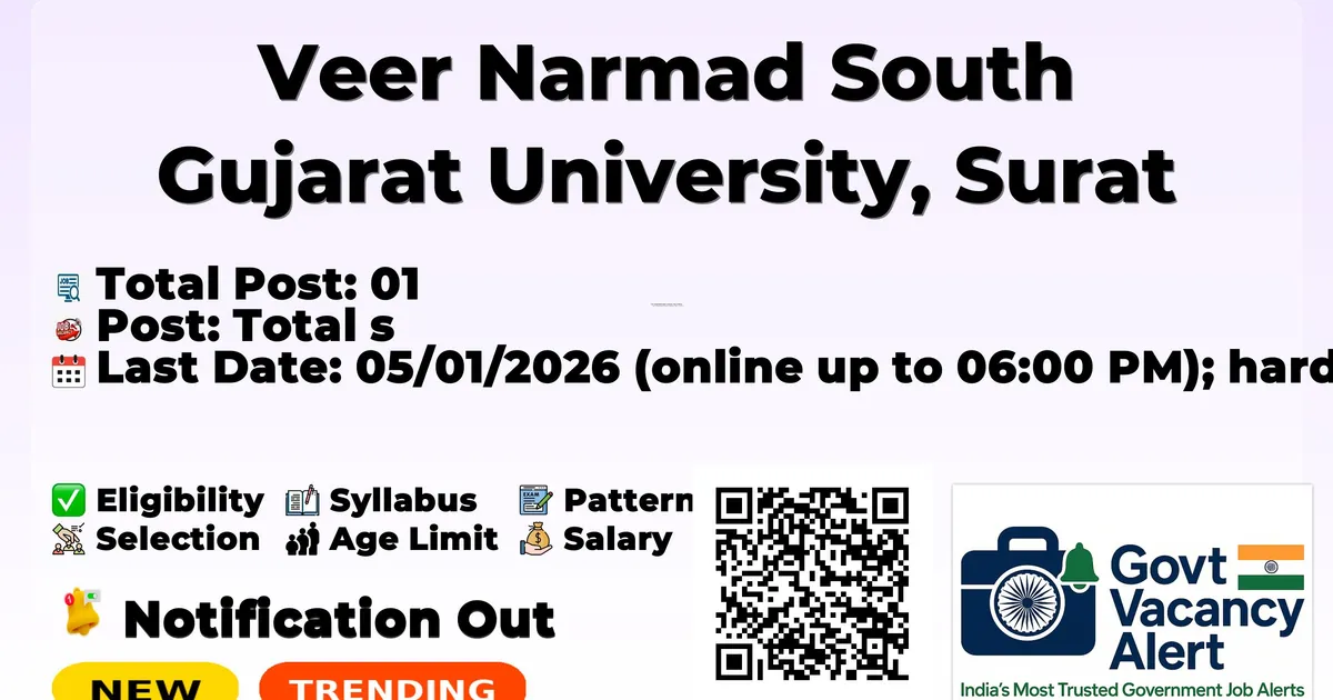 Company Name Veer Narmad South Gujarat University, Surat (VNSGU) Post Name Professor (Physics) No of Posts 01 Salary Pay Level 14, Rs. 1,44,200 - 2,18,200 per month as per 7th Pay Commission Qualification M.Sc. (Physics) with prescribed specialization and Ph.D. with UGC 2018 Professor eligibility (A or B) Age Limit As per UGC Regulations 2018 and State Government norms (no specific age given) Start Date for Apply 01/12/2025 Last Date for Apply 05/01/2026 (online up to 06:00 PM); hard copy up to 15/01/2026 Official Website https://www.vnsgu.ac.in, https://vnsgurec.samarth.edu.in