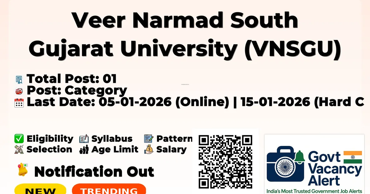 Veer Narmad South Gujarat University (VNSGU) has released an official notification for the recruitment of 01 Director Posts. Interested and eligible candidates can apply Online through the official VNSGU website. The last date to submit the application form is 15-01-2026. In this article, you’ll find the VNSGU Director Posts recruitment details, including eligibility criteria, age limit, salary structure, selection process, application steps, and direct links to the official notification and Online application form.