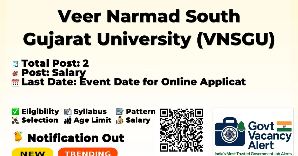 Veer Narmad South Gujarat University (VNSGU) Research Adviser & Statistical Analysis Notification 2026 has been released on the official website vnsgu.ac.in. A total of 2 vacancies have been announced through the VNSGU Research Adviser & Statistical Analysis Recruitment 2026.
